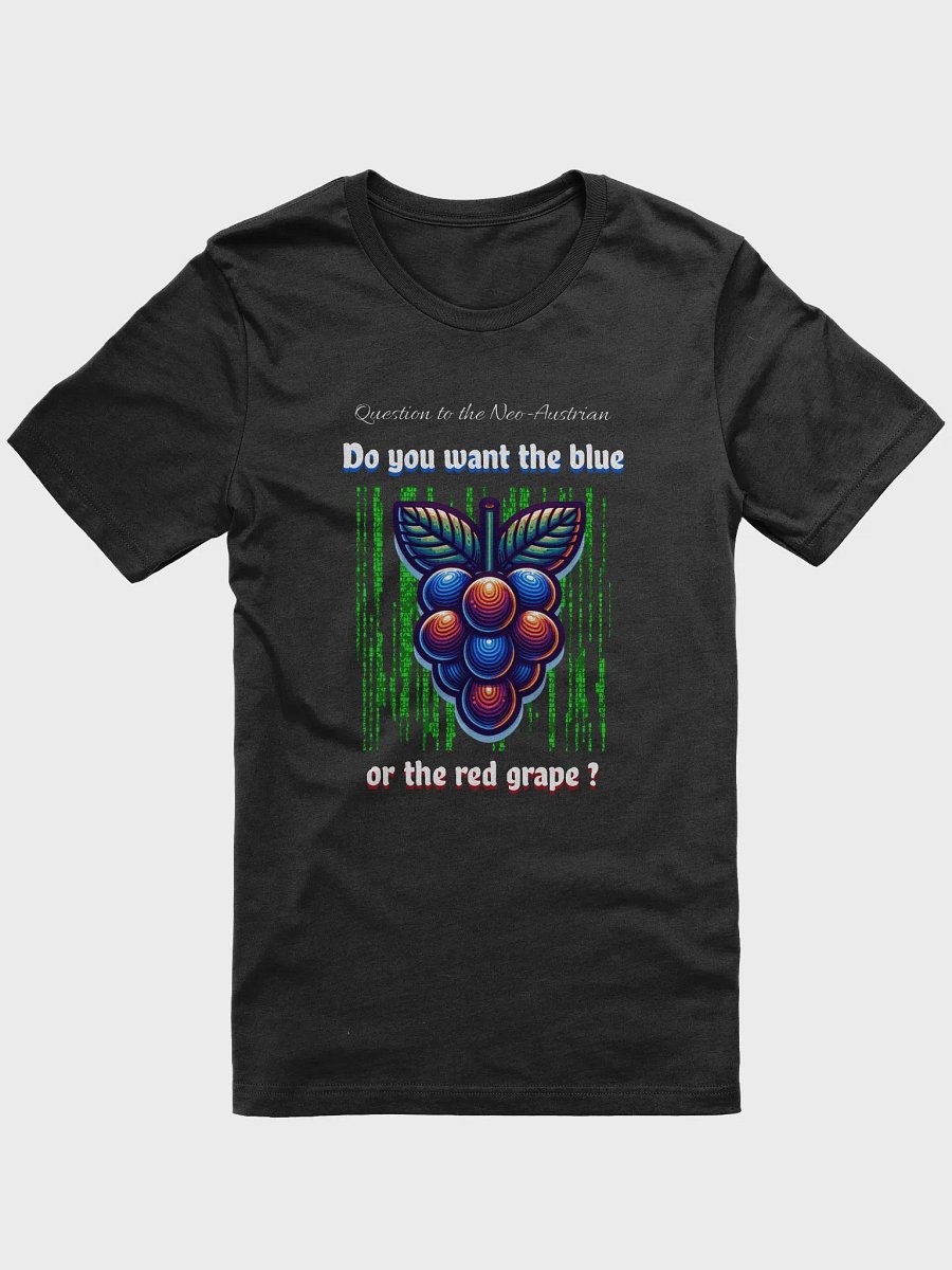 Funny saying "Question to the Neo-Austrian: Do you want the blue or the red grape?" with a beautiful illustration showing blue and red grapes, very stylish, perfect gift, humor, sarcasm, pflugart, morpheus, anderson, smith